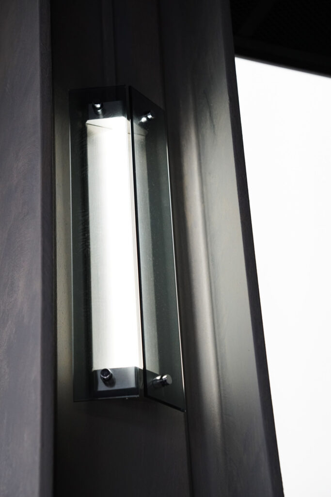 保留H 型鋼結構本質,並於鋼構上加裝灰玻燈具,使結構同時成為照明與空間節點。讓建築本身成為空間的區隔與裝飾。