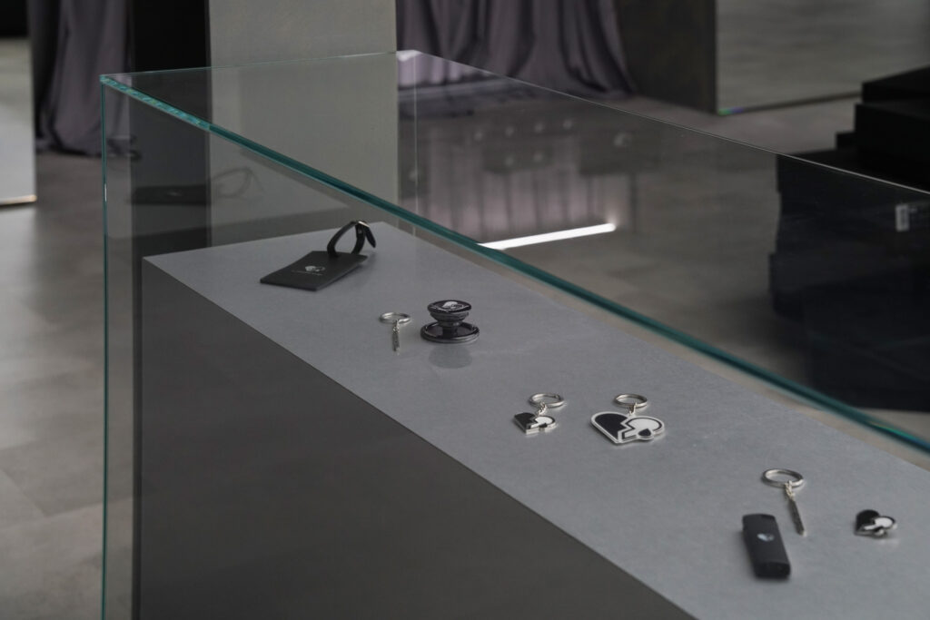 空間中特別設置玻璃島台作為周邊配件的展示核心。以低存在感的玻璃結構,取代傳統厚重櫃體,讓視線能夠穿透展示物本身,維持整體空間的通透感。
